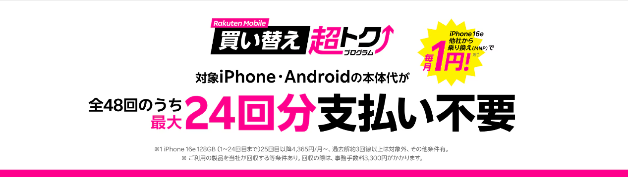 例えば、楽天モバイルでは、現在iPhone 16eを支払い総額実質24円で購入できるキャンペーンが実施中です。
