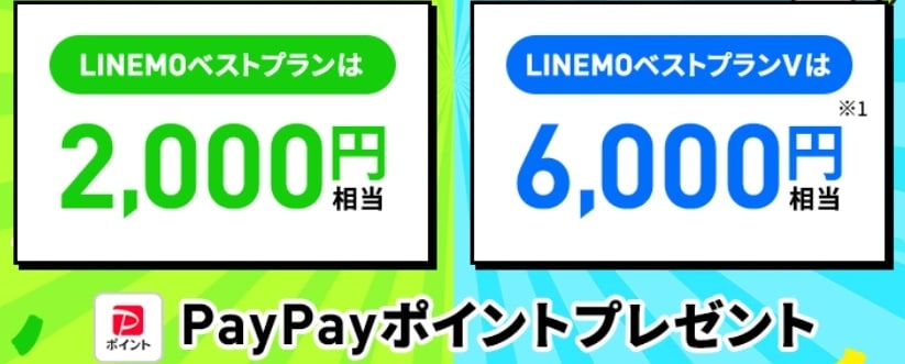 - LINEMOベストプランV:6,000円相当のPayPayポイント