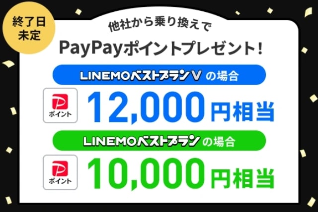 - LINEMOベストプランV:12,000円相当のPayPayポイント