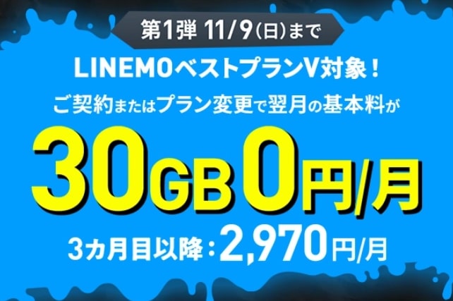 LINEMOベストプランVは通常30GB2,970円(税込)なので、30GBを0円で利用できるチャンスです。