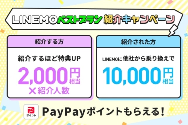 - LINEMOベストプラン:10,000円相当のPayPayポイント