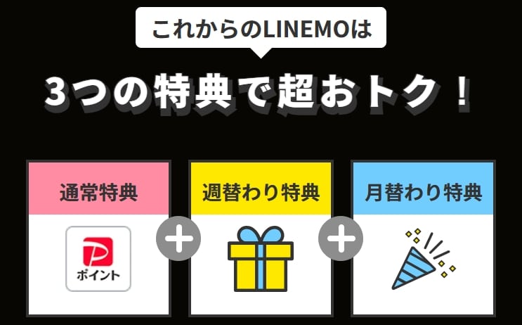 LINEMOでは毎週・毎月変わる「LINEMO週穫祭」を開催しています。LINEMO週穫祭は「通常特典」+「週替わり特典」+「月替わり特典」の3つの特典で大変お得です。