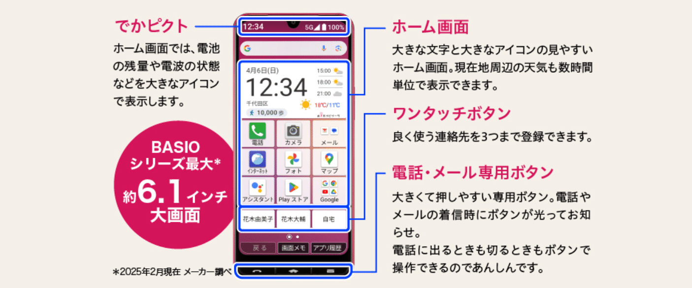 基本機能が物理ボタンで、文字やアイコンの表示が大きくシンプルなため、初めてのスマホでも使いやすいモデルです。