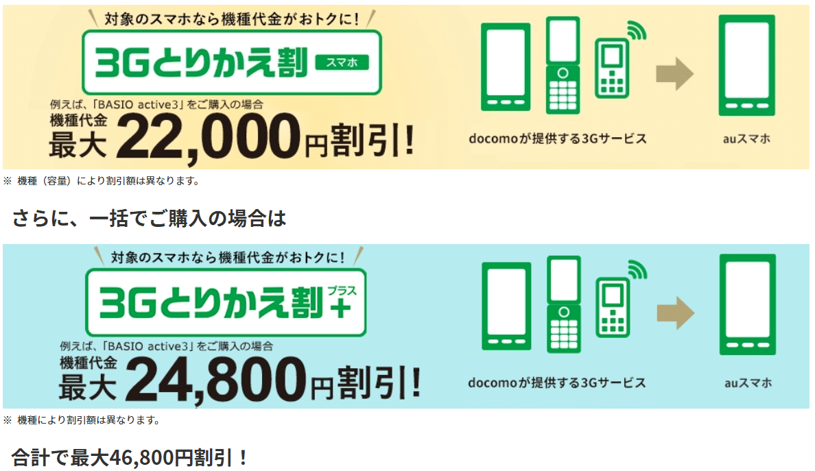 | 提供条件 | ①②を同時に満たすこと ①docomoが提供する3Gサービスを利用中 ②対象のauスマホを購入(3Gとりかえ割プラスの場合は一括払いで購入) |