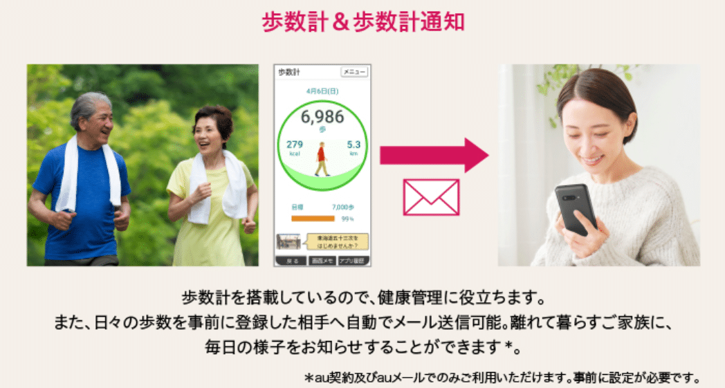 BASIO active3には、離れて暮らす家族に日々の歩数を、自動で送信するお知らせ機能も搭載されています。