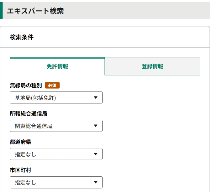 - [検索・統計]>[無線局等情報検索]>[エキスパート検索]をタップする