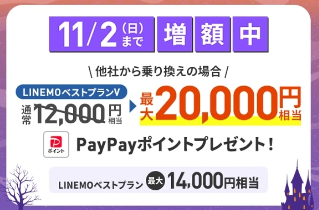 - LINEMOベストプラン:10,000円相当のPayPayポイント