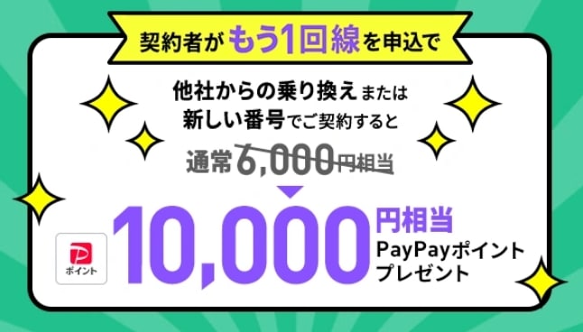 →他社乗り換えまたは、新しい番号で契約すると10,000円相当のPayPayポイント還元・2回線をまとめて申し込みたい人