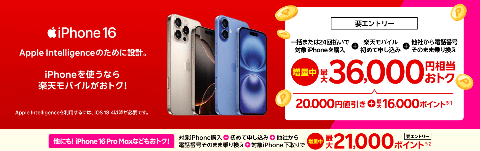 楽天モバイルでは、電話番号そのまま他社からの乗り換えで申し込み&対象製品を購入で、端末料金が22,000円引きになるキャンペーンを実施しています。