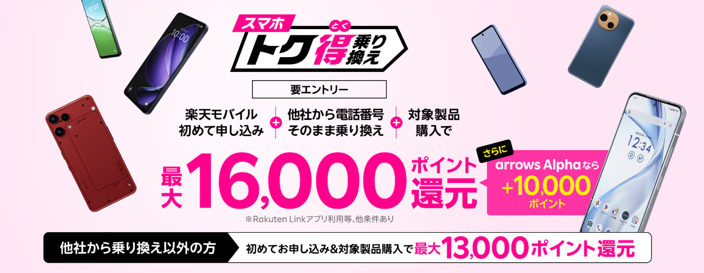- エントリー後、楽天モバイルへ初めて申し込み&他社から電話番号そのまま乗り換え:10,000ポイント