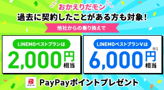 - LINEMOベストプランV:6,000円相当のPayPayポイント