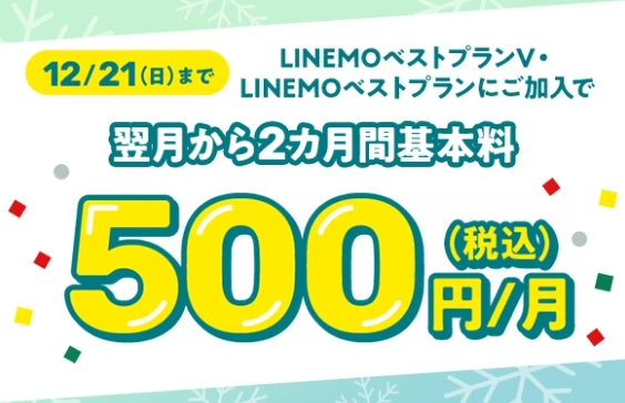 【LINEMO週獲祭|週替わり特典】12月第3弾 LINEMO 基本料2カ月500円キャンペーン