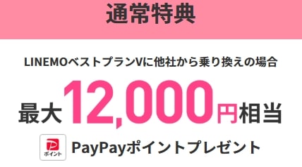 ③キャンペーンページを経由期間 2025年12月22日~2026年1月12日 LINEMOでは、ベストプラン、ベストプランVに他社からの乗り換えで申し込みをすると、ベストプランは6,000円相当、ベストプランVは10,000円相当のPayPayポイントをプレゼントするキャンペーンを開催中です。