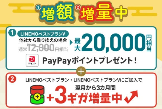 3カ月間データ増量の場合は①②に加え、③割引対象期間中に「データ追加購入(550円/1GB)」期間 2025年12月22日~2026年1月12日 12月第4弾 年末年始PayPay増額キャンペーンは、他社から乗り換え(MNP)、または新しい番号で「LINEMOベストプラン」「LINEMOベストプランV」に契約すると、PayPayポイントが特典の対象となる対象キャンペーンのポイントが最大8,000円相当増額になるキャンペーンです。