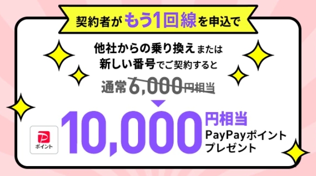 特典 2回線目以降申し込みで、PayPayポイント最大10,000円相当プレゼント 適用条件 ①LINEMO契約者がキャンペーン対象申込期間中に「ベストプラン」「ベストプランV」に新しい電話番号・他社から乗り換えで申し込むこと