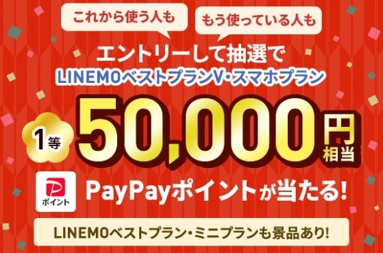 →抽選で総勢6万名以上に最大50,000円相当のPayPayポイントが当たる適用条件 ①LINEMOの「LINEMOベストプラン」「LINEMOベストプランV」に申し込み&利用開始