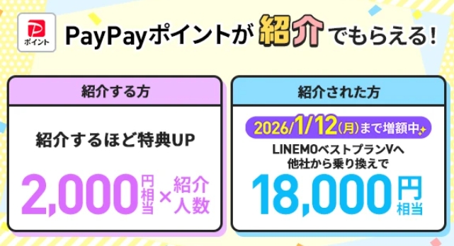 利用開始期間にLINEMOの利用を開始期間 2025年12月22日~2026年1月12日 LINEMOでは、1人紹介で2,000円相当のPayPayポイントを還元するキャンペーンを開催中です。
