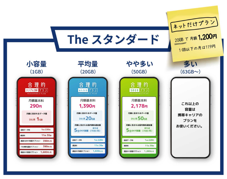 | 基本プラン+ 大盛りオプション | 110GB | 4,950円 |