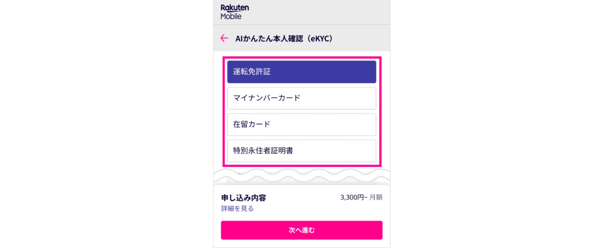 「書類の撮影」を選択し、運転免許証またはマイナンバーカードを選び、「次へ進む」をタップします。