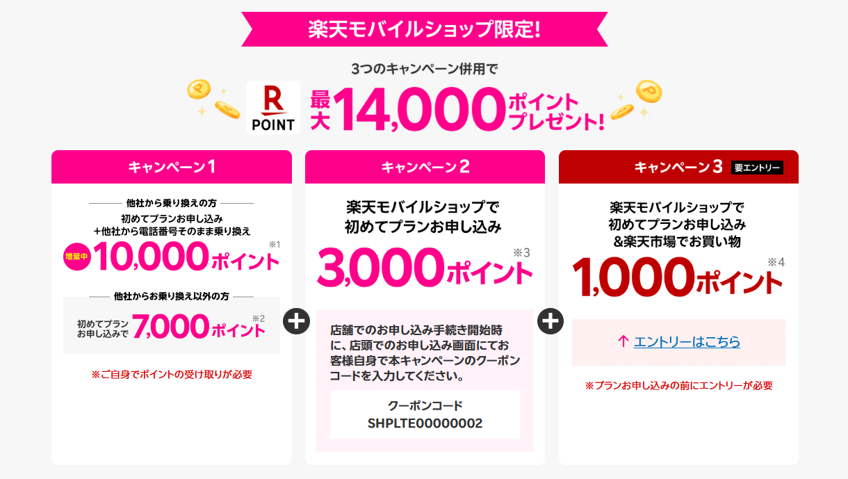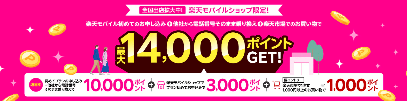 楽天モバイルショップ限定キャンペーンは、楽天モバイルショップで初めてプラン申し込み&他社からそのまま乗り換え&エントリー+楽天市場で1,000円以上の購入で最大の14,000ポイントが還元されるキャンペーンとなります。