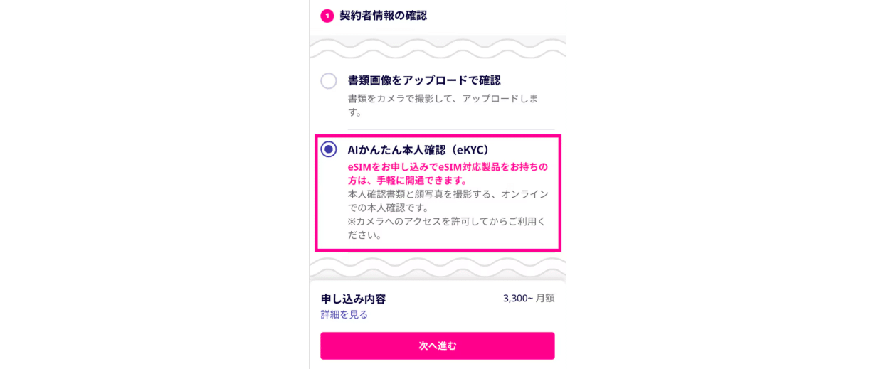 即日開通するためには、eKYCで本人確認する必要があります。また、手元にeSIM対応製品を用意してください。