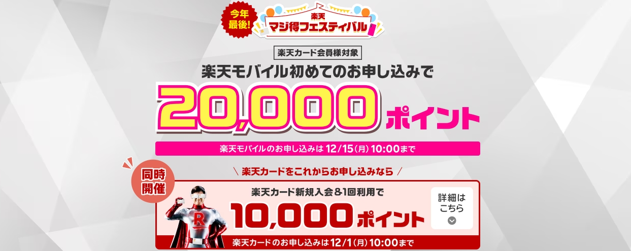 ③「Rakuten最強プラン」利用開始期間 2024年12月6日~終了日未定 楽天モバイルでは、新規契約&電話番号そのまま、他社からのお乗り換えで対象製品を購入すると20,000円相当のポイント還元を実施しています。