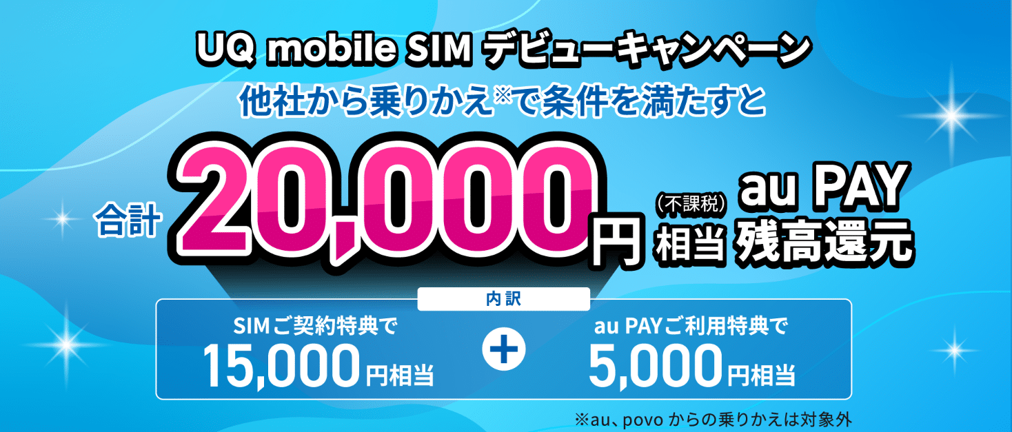 「UQ mobile SIM デビューキャンペーン」は、最大20,000円相当(不課税)のau PAY残高還元キャンペーンです。