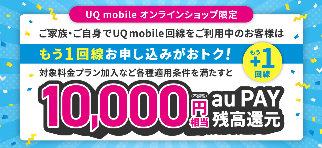 ご家族ご自身で利用中の方が対象で、条件を満たしもう1回線契約することで、最大10,000円相当(不課税)のau PAY残高が還元されます。