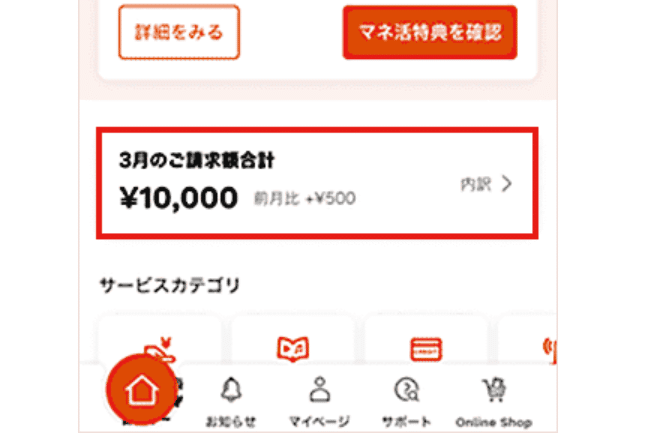 My UQ mobileアプリを利用する場合には、アプリを開いて「○月のご請求金額合計」のボタンをタップしてください。タップすると、請求金額の内訳や前月との比較を確認できます。