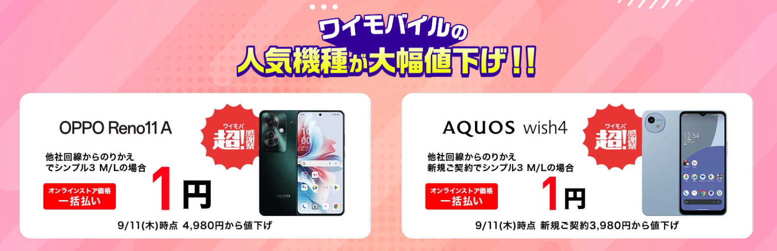 ワイモバイルでは、端末価格が大幅にお得になるセールがオンライン限定で実施されています。新規契約や他社回線から乗り換えの契約で対象の機種代金1円~とかなりお得になるキャンペーンです。