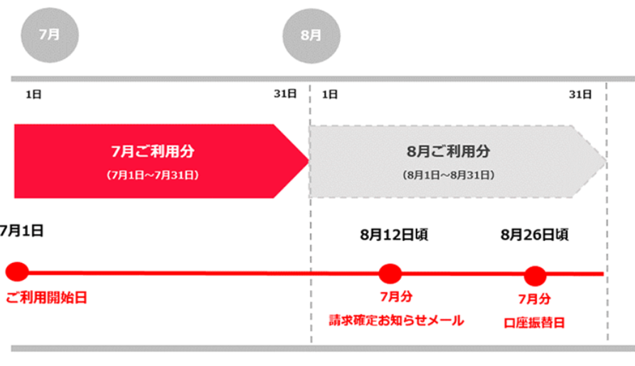 利用期間は原則として「毎月1日〜末日」で、前月分の請求金額は翌月10日ごろに確定します。