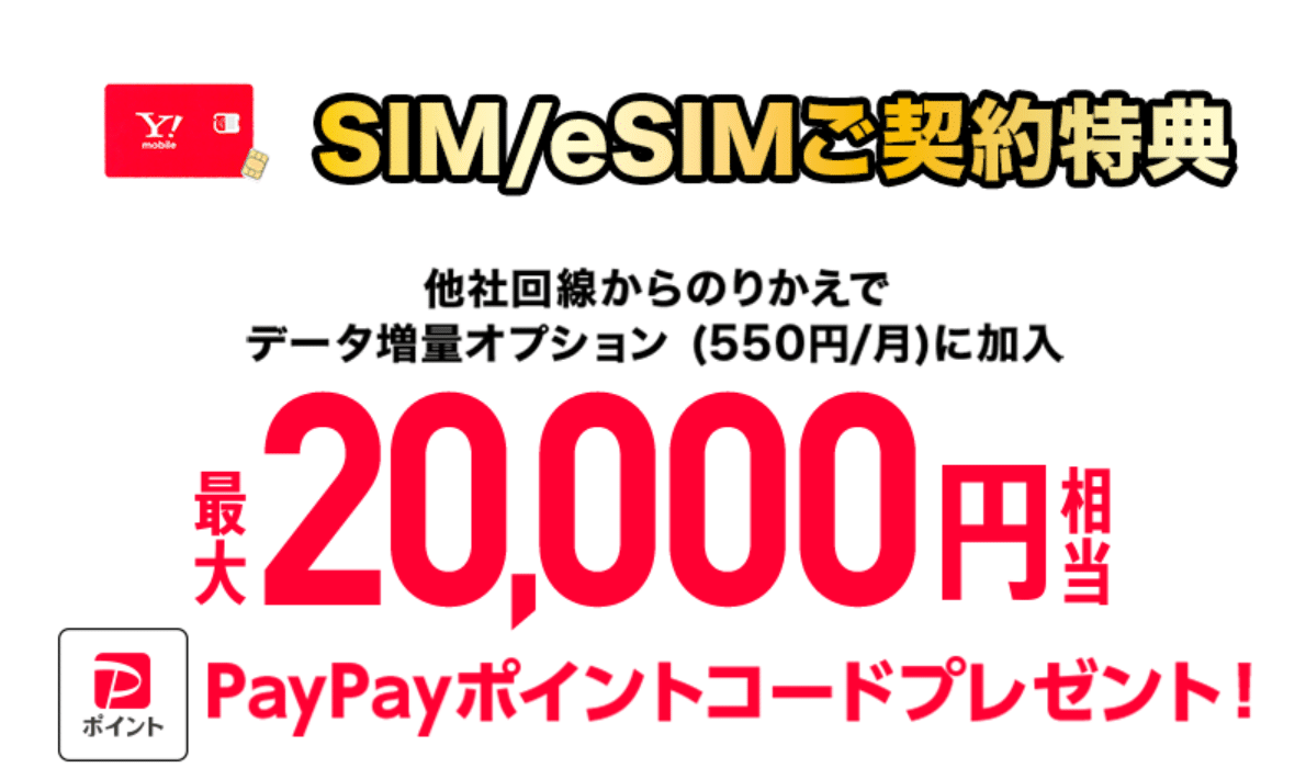 | 特典 | 他社からのりかえ/新規契約&データ増量オプション加入で最大20,000円相当のPayPayポイントプレゼント |