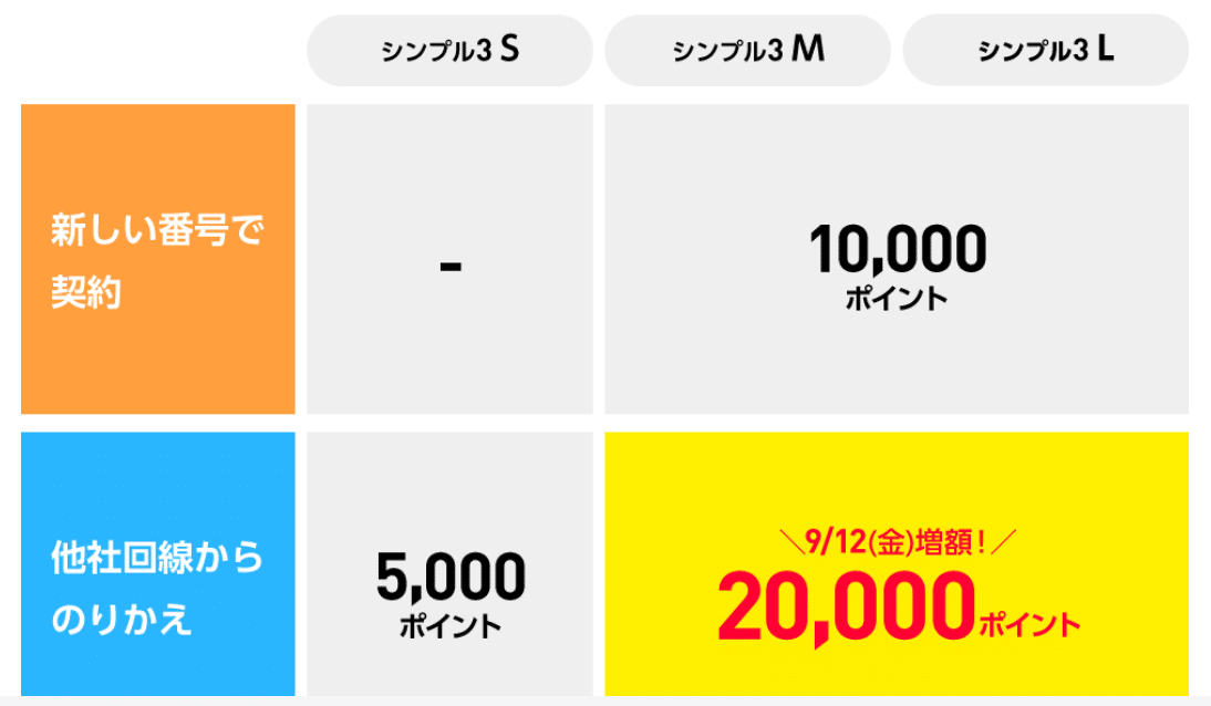 また、新しい番号でシンプル3 M/Lを契約すると通常10,000ポイントですが、今なら利用者年齢が5~18歳の場合、シンプル3通常特典の3倍の15,000ポイントになるため、お子さんのスマホデビューにもおすすめです。