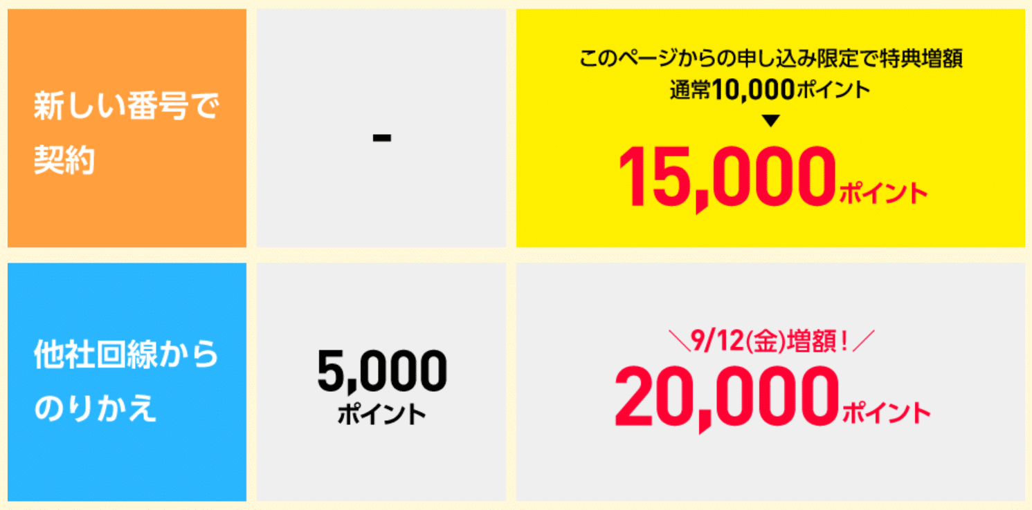 このキャンペーンでは、申込種別によって最大20,000円相当のPayPayポイントを受け取れます。新しい番号の場合は、最大15,000円相当、乗り換えの場合は最大20,000円相当です。