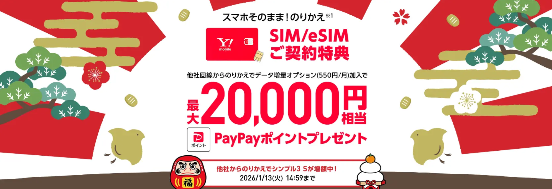 年末年始限定でシンプル3Sの場合でも20,000円相当還元を受けられます。この機会にぜひ乗り換えをおすすめします。