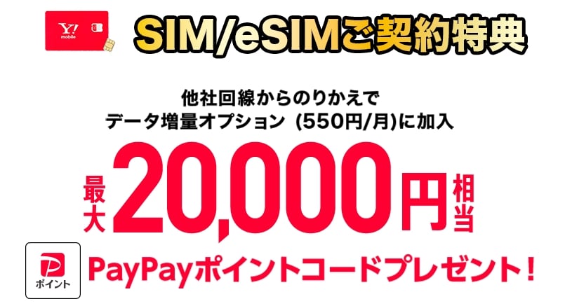 SIMカード/eSIM特典の場合は、シンプル3 M/Lに申し込みと同時にデータ増量オプションに加入、PayPayポイントコードを開通月の翌々月末までにPayPayチャージ期間 2026年1月13日~終了日未定 「ワイモバイル追加申込キャンペーン」は、もう1回線追加申込をすると、最大22,416円割引と大変お得になります。