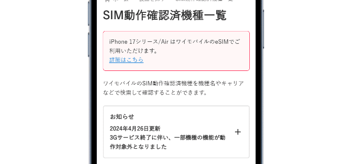 そのため、対応機種かどうか、ワイモバイル公式の「SIM動作確認端末一覧」で確認しましょう。