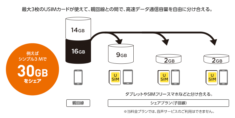 | シンプル3 M、シンプル2 M | 30GB(親回線との合算)※1 | |||